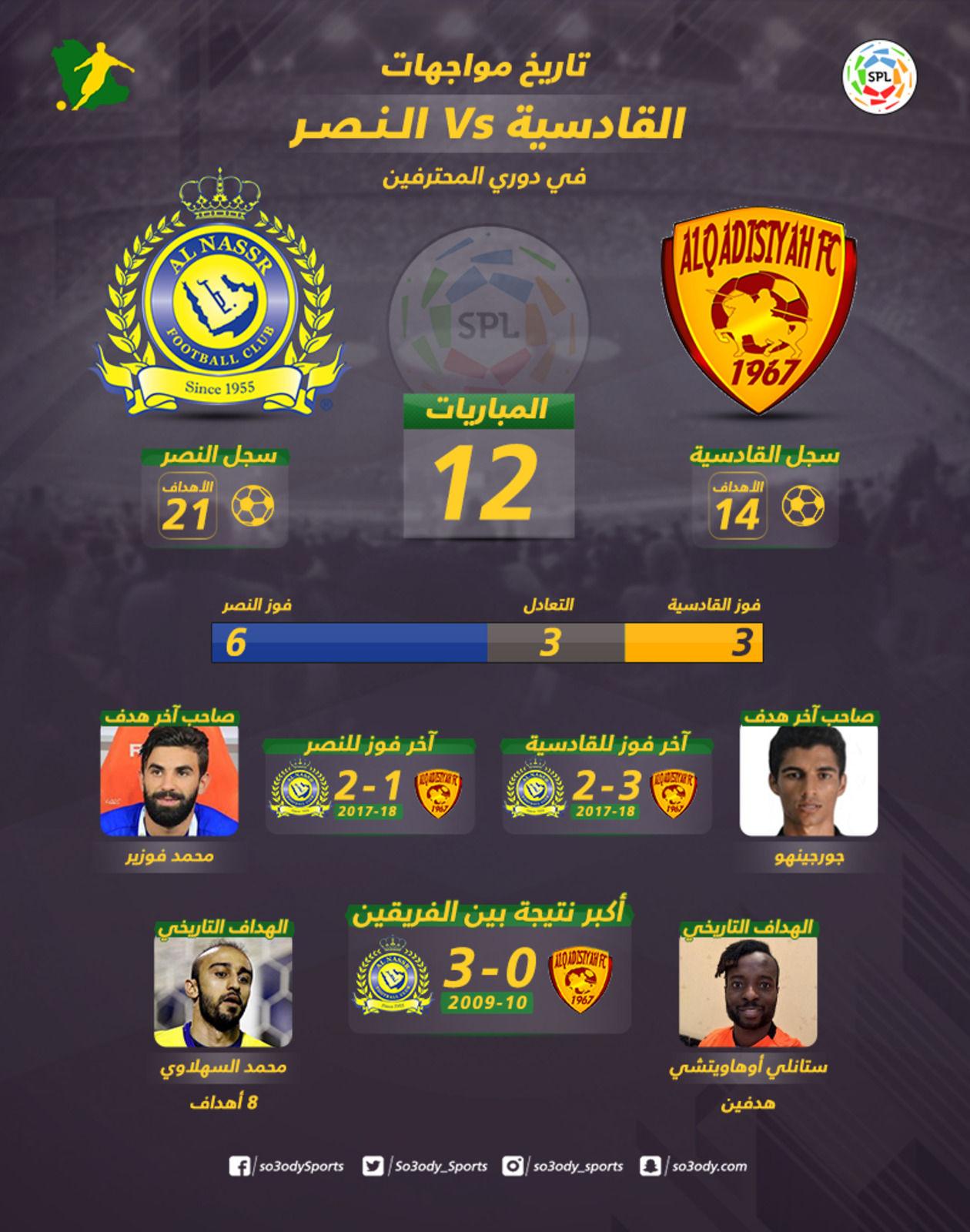 ووقع جورجينهو على أخر هدف للقادسية في النصر، بينما سجل المغربي محمد فوزير أخر هدف للعالمي، علمًا أن الموسم الماضي شهد فوز القادسية (3-2) وفوز النصر (2-1).