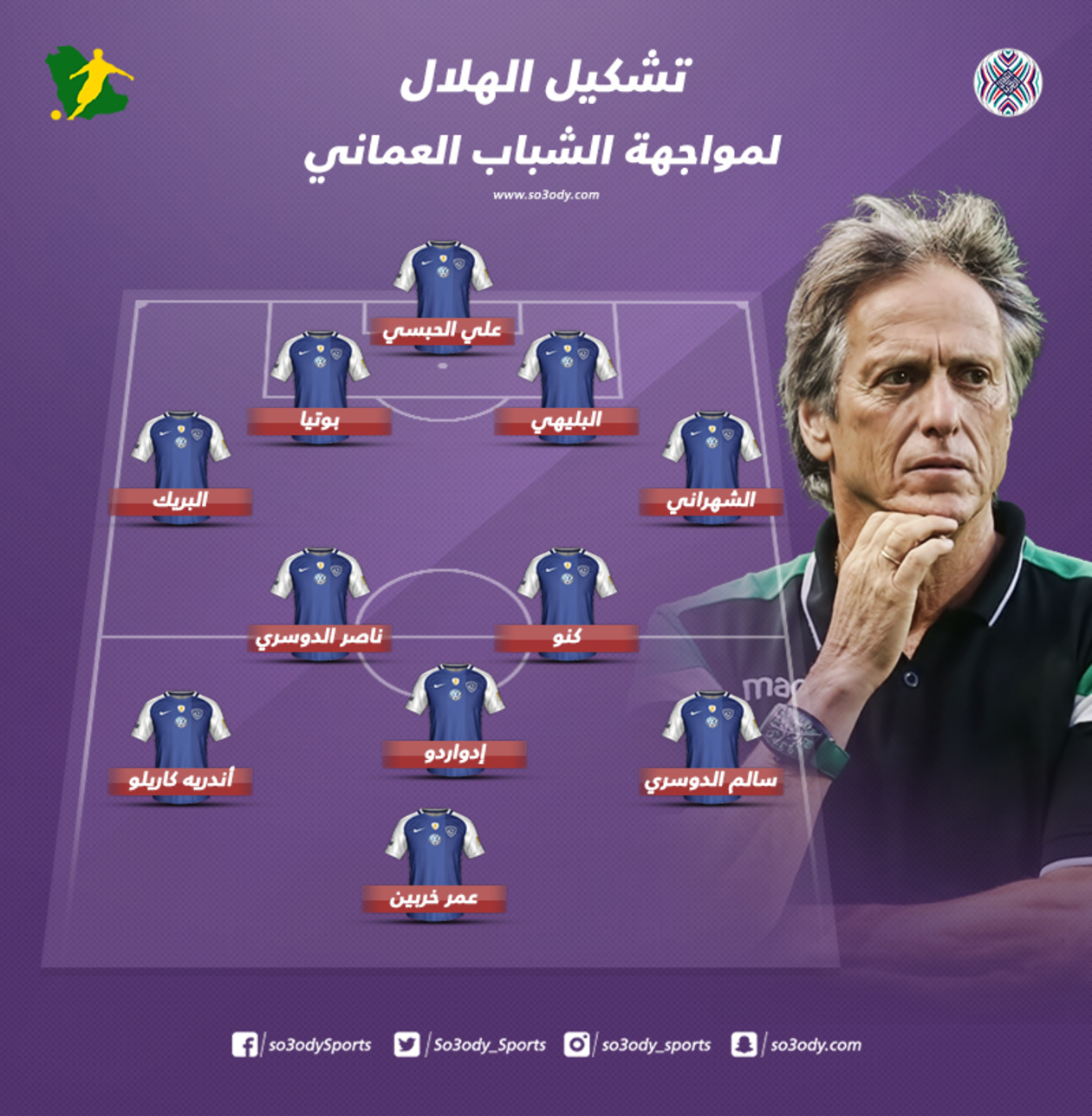 أعلن البرتغالي خوروخي جيسوس المدير الفني للفريق الأول لكرة القدم بنادي الهلال، تشكيل الفريق استعدادا لمواجهة الشباب العماني.