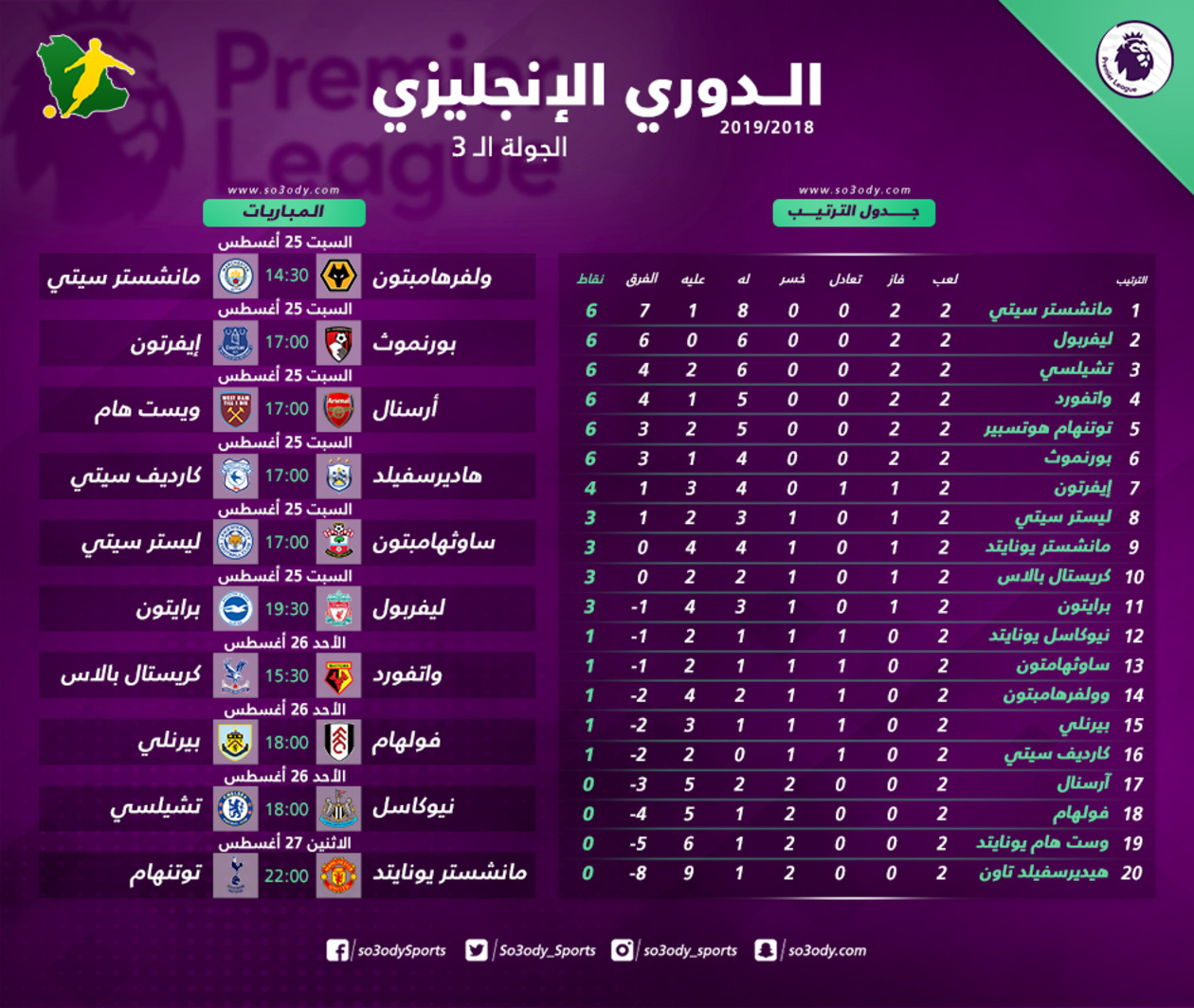 الجولة الثالثة ستشهد مباراة هي الأقوى، بين مانشستر يونايتد الجريح بالخسارة الأخيرة أمام برايتون، وبين توتنهام، والتي ستقام على ملعب أولد ترافورد الخاص بنادي مانشستر يونايتد.