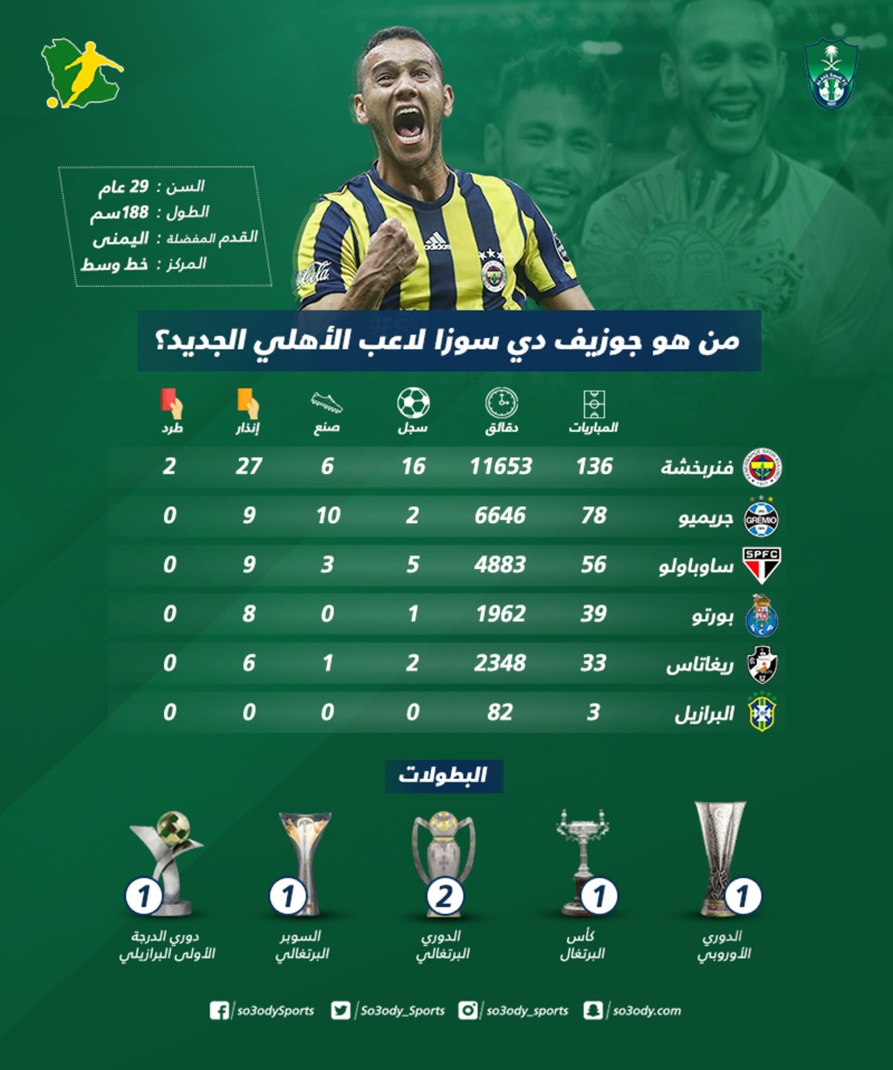 تعاقد مجلس إدارة النادي الأهلي برئاسة ماجد النفيعي، مع البرازيلي جوزيف دي سوزا لاعب وسط نادي فنربخشة التركي، خلال فترة الانتقالات الصيفية الجارية.