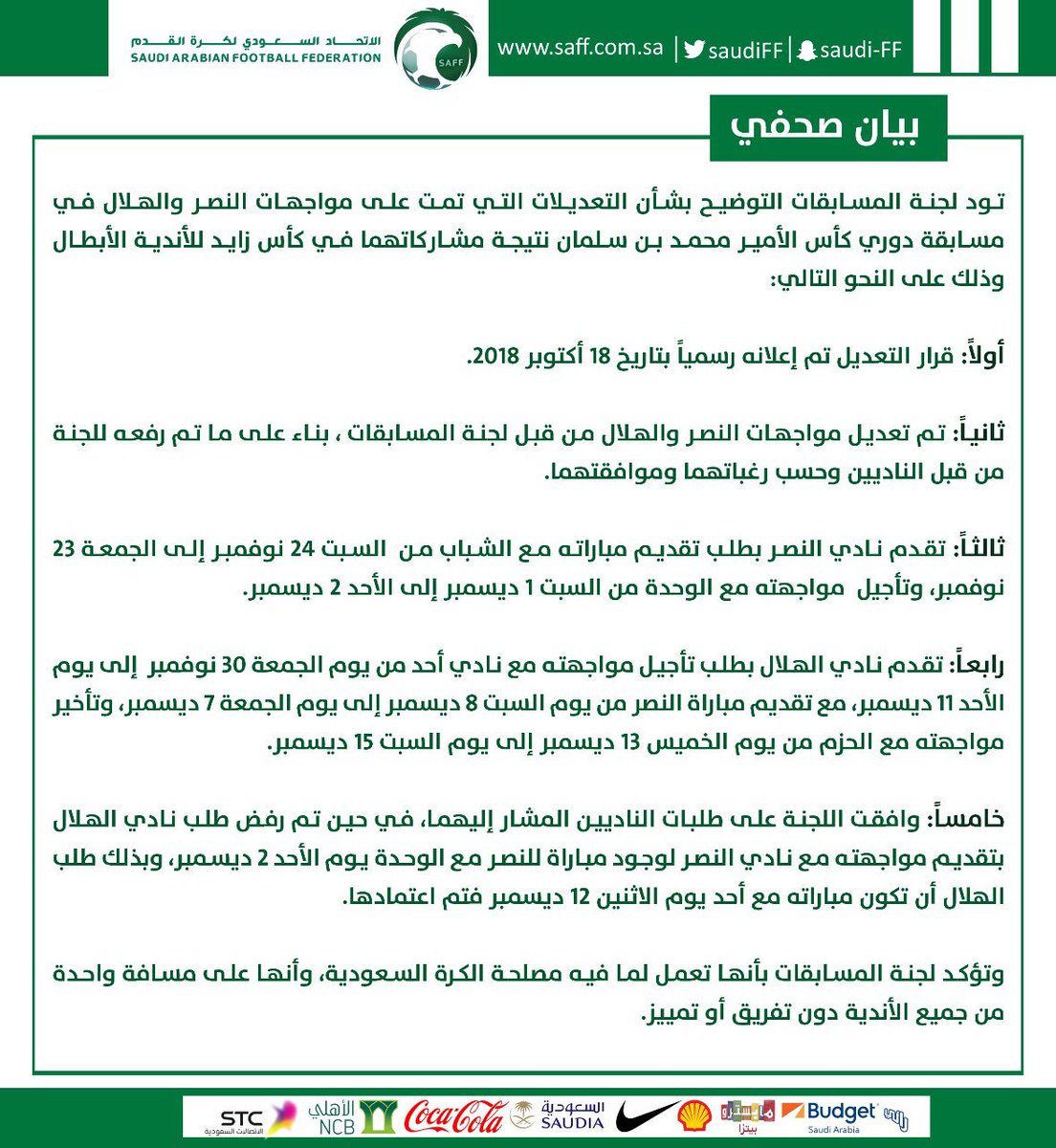 ثانيًا: تم تعديل مواجهات النصر والهلال من قبل لجنة المسابقات، بناء على ما تم رفعه للجنة من قبل الناديين وحسب رغباتهما وموافقتهما.