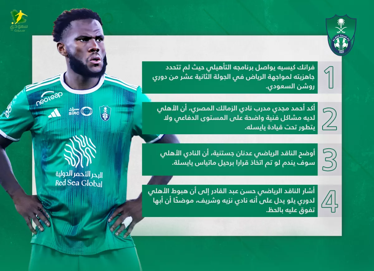 فرانك كيسيه يواصل برنامجه التأهيلي حيث لم تتحدد جاهزيته لمواجهة الرياض في الجولة الثانية عشر من دوري روشن السعودي.