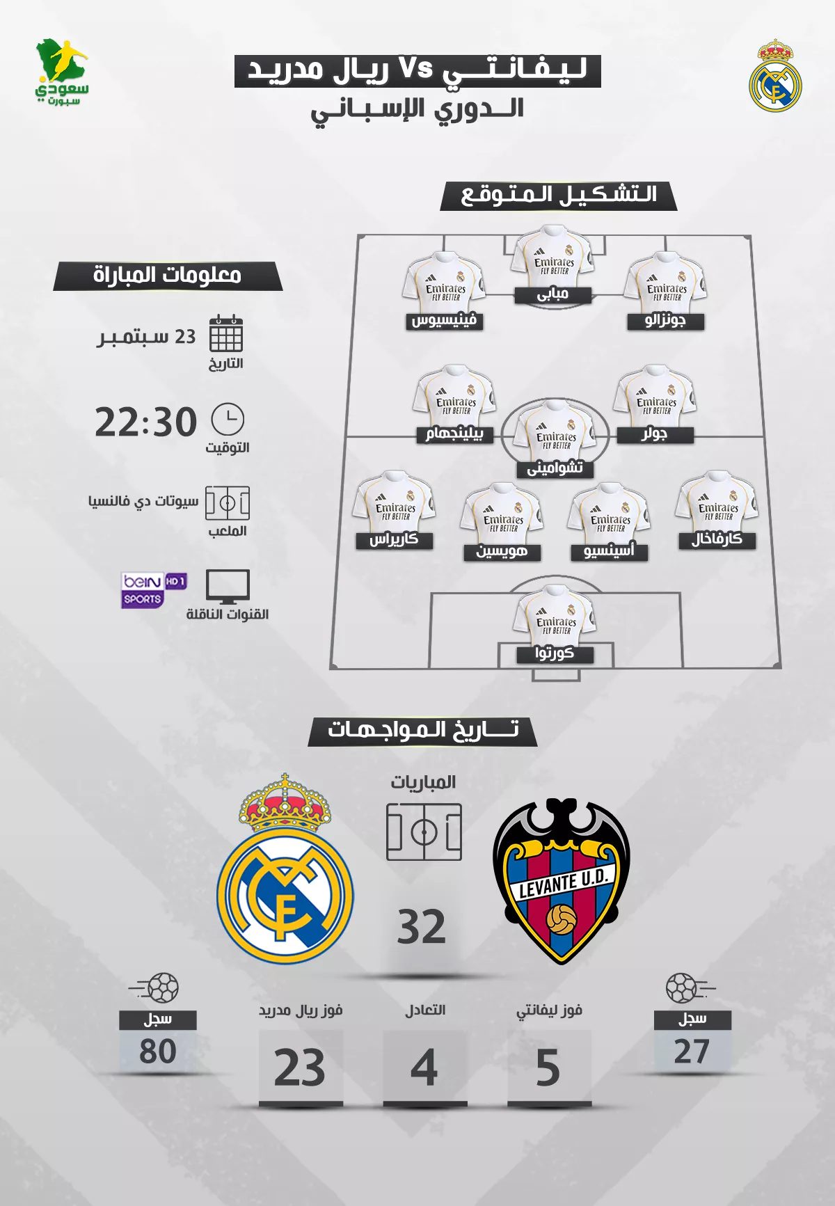 وتنطلق مباراة ليفانتي وريال مدريد في العاشرة والنصف مساءً، على ملعب سيوداد دي فالنسيا.