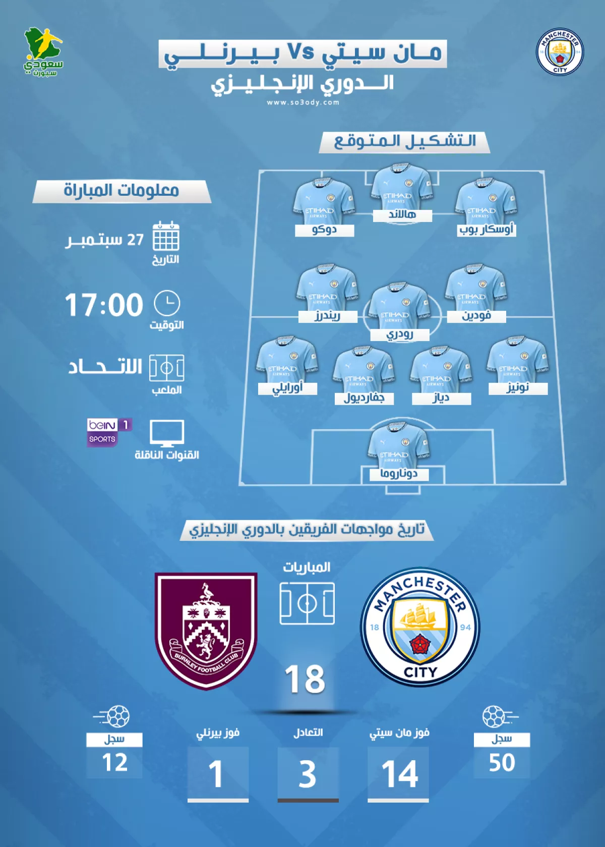 يلتقي اليوم فريق مانشستر سيتي، نظيره بيرنلي ، ضمن لقاءات الجولة السادسة لبطولة الدوري الإنجليزي الممتاز .