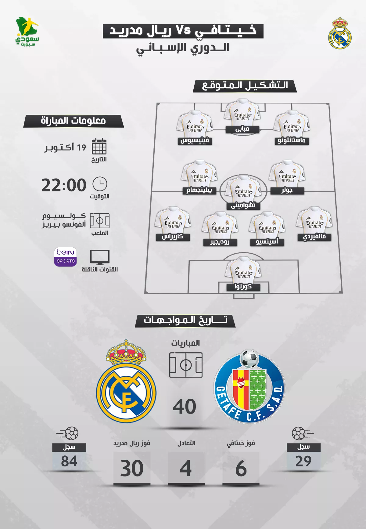 تتوجه أنظار عشاق كرة القدم الإسبانية نحو ملعب كوليسيوم ألفونسو بيريز، لمتابعة مواجهة قوية ومثيرة تجمع بين خيتافي وضيفه الثقيل ريال مدريد، ضمن منافسات الجولة التاسعة من الدوري الإسباني (لا ليجا).