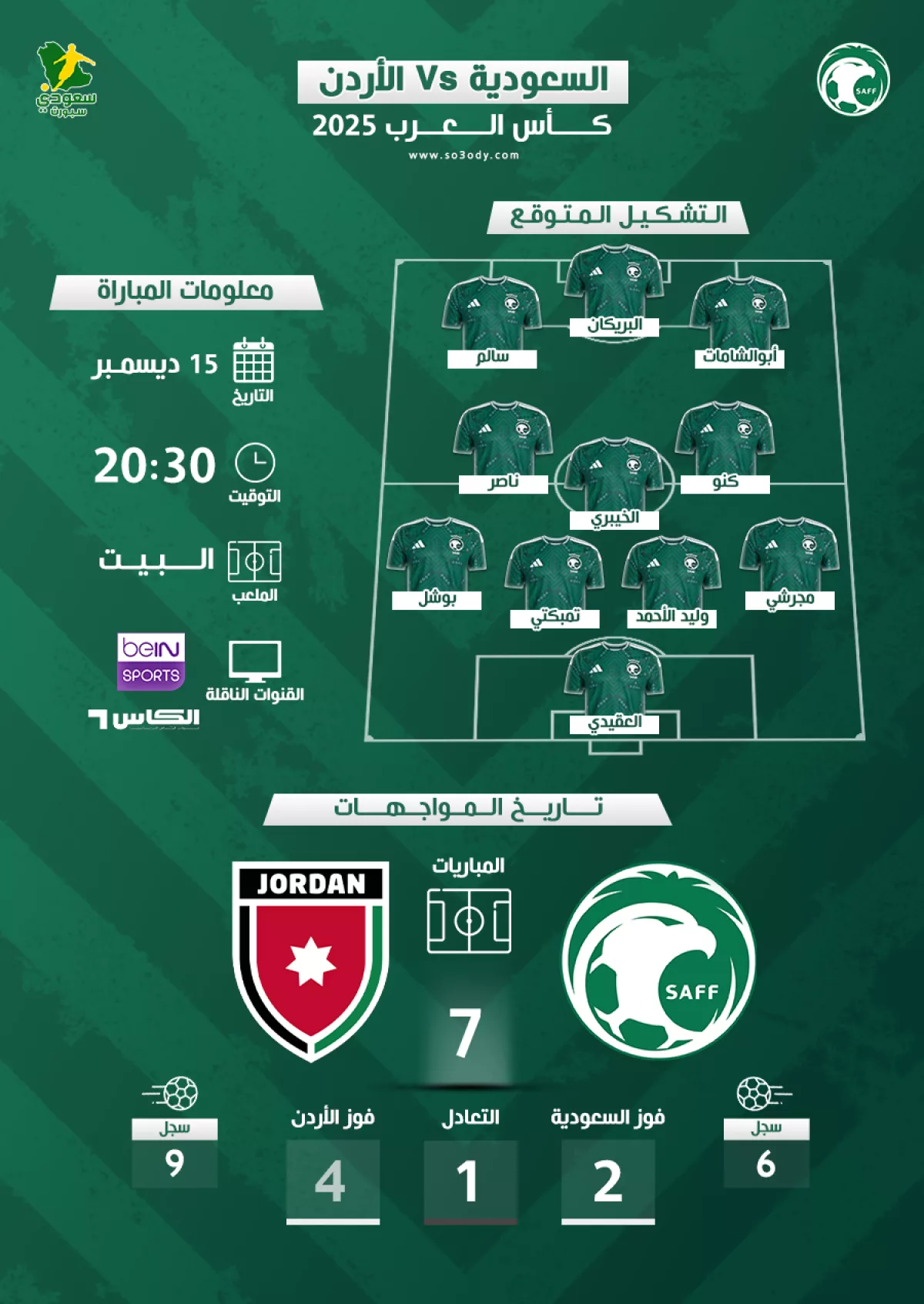 يستعد المنتخب الوطني السعودي لخوض مواجهة حاسمة أمام نظيره الأردني، ضمن منافسات الدور نصف النهائي من بطولة كأس العرب 2025، في لقاء مرتقب يحتضنه ملعب البيت بمدينة الخور القطرية.
