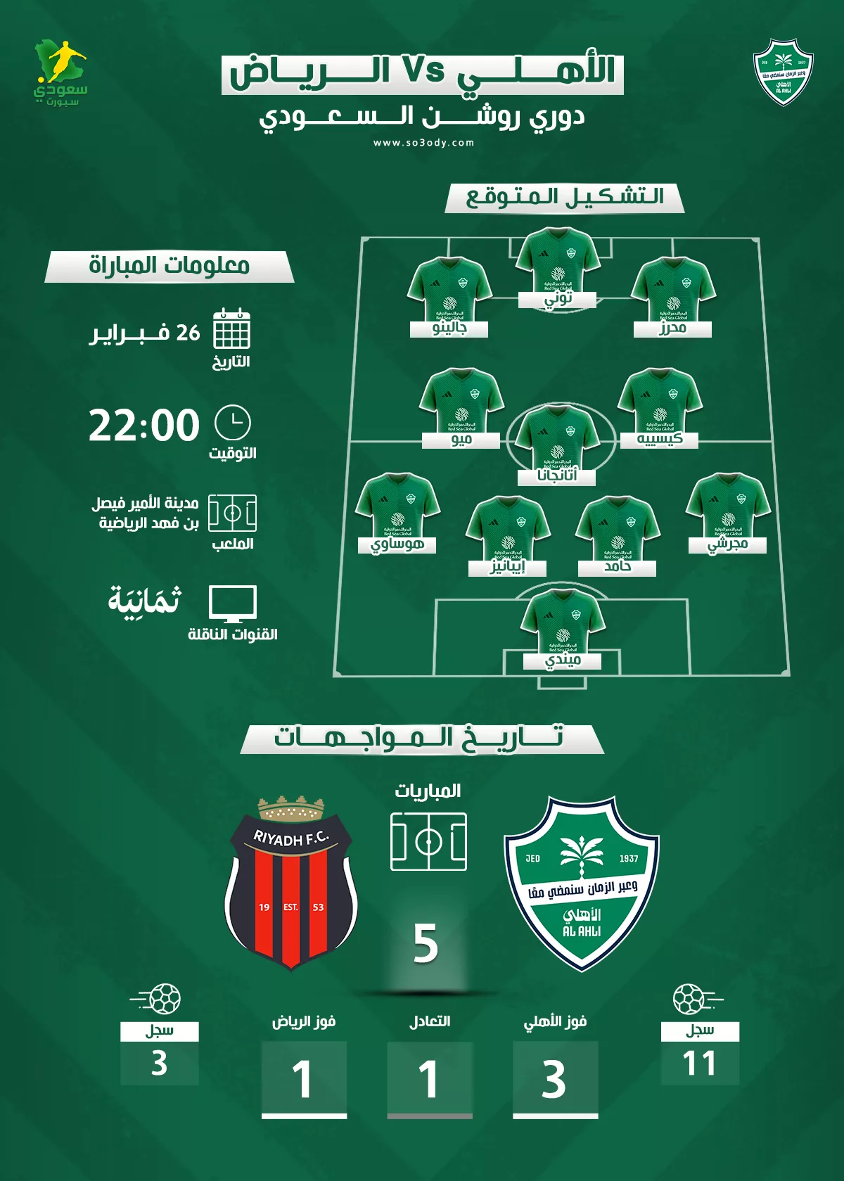 ويدخل "الراقي" هذه المواجهة وعينه على النقاط الثلاث لمواصلة مطاردة الصدارة، مستنداً إلى تفوقه التاريخي الواضح في المواجهات المباشرة، حيث التقى الفريقان في 5 مباريات، نجح الأهلي في الفوز بـ 3 منها وسجل 11 هدفاً، بينما حقق الرياض فوزاً وحيداً وسجل 3 أهداف.