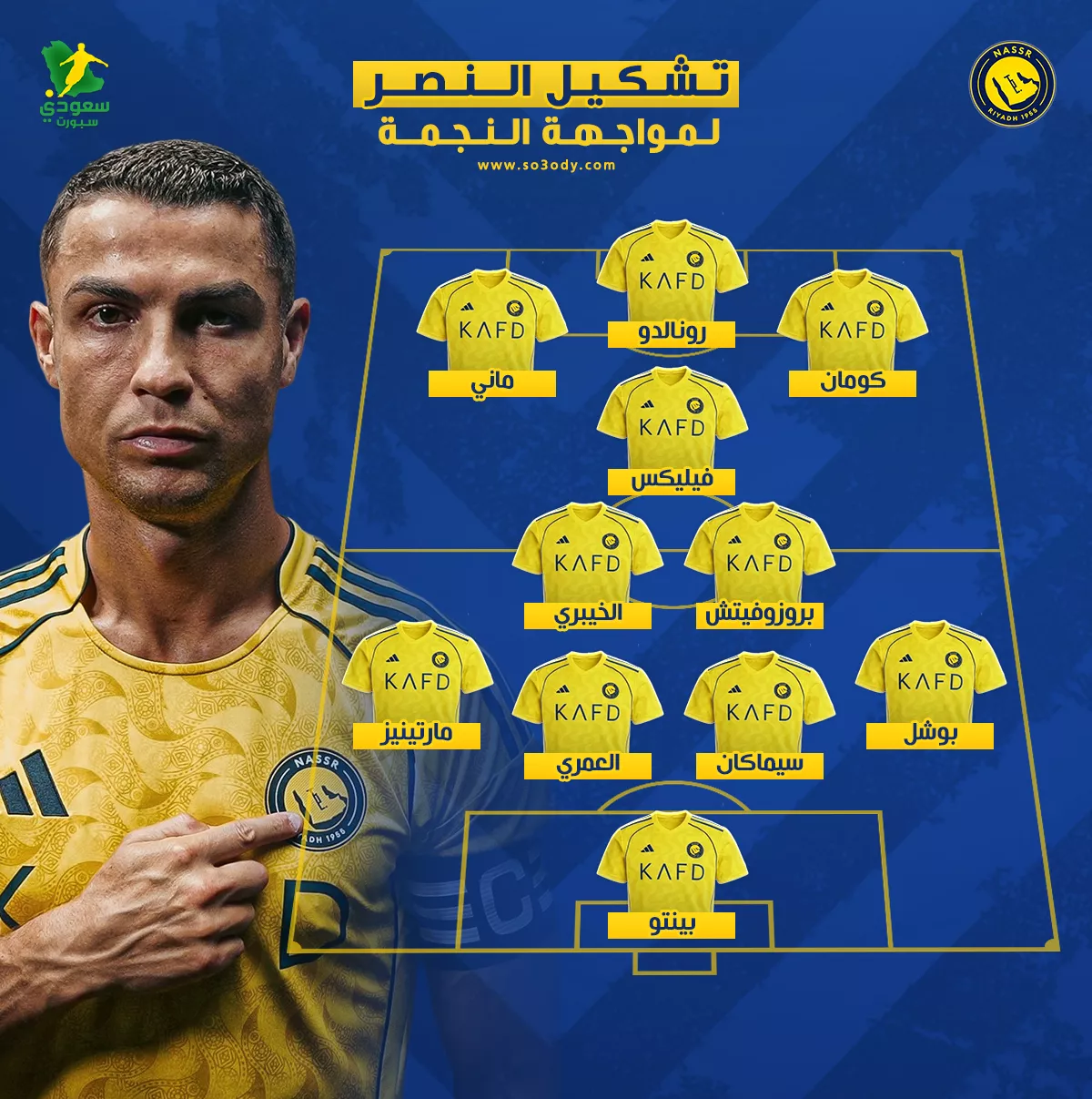أعلن البرتغالي خورخي خيسوس، المدير الفني لنادي النصر، تشكيل "العالمي" الرسمي ضد النجمة، ضمن منافسات دوري روشن.
