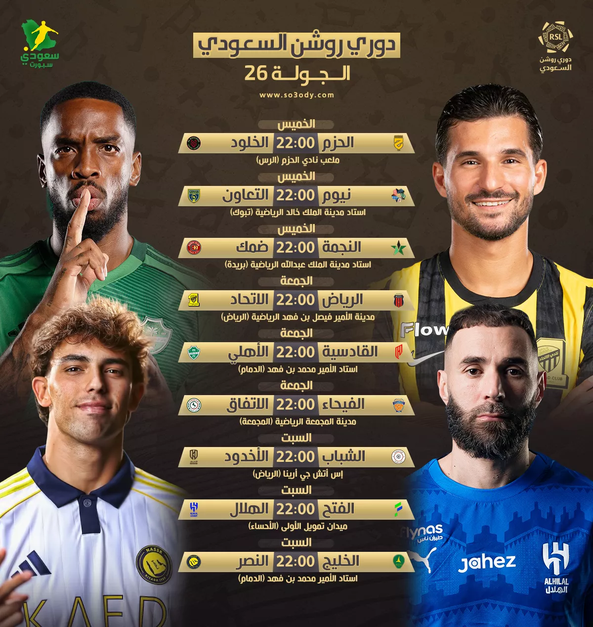 سيكون عشاق كرة القدم السعودية في كل مكان، على موعد مع انطلاق مباريات الجولة 26 من منافسات دوري روشن السعودي (2025-2026).