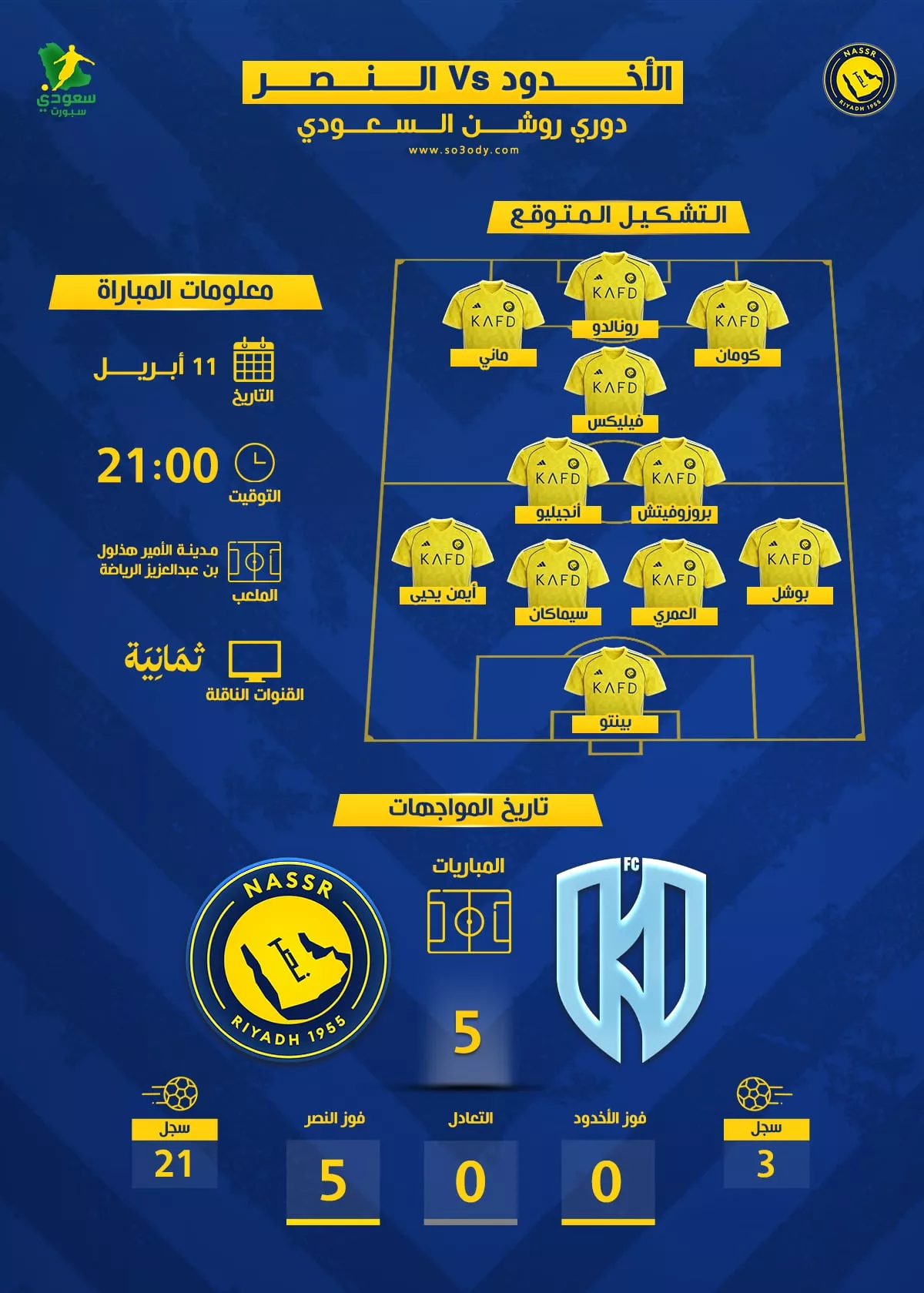 يحل الفريق الأول لكرة القدم بنادي النصر ضيفًا ثقيلًا على نظيره نادي الأخدود في مدينة نجران، ضمن منافسات الجولة التاسعة والعشرين من مسابقة دوري روشن السعودي للمحترفين.