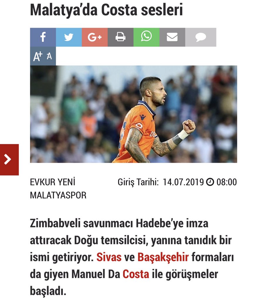 وقالت صحيفة "aspor" التركية، أن مدرب نادي مالاتيا التركي طلب من ناديه التعاقد مع الدولي المغربي مروان دا كوستا والنادي سيدخل في مفاوضات مع الاتحاد من أجل ضم اللاعب.