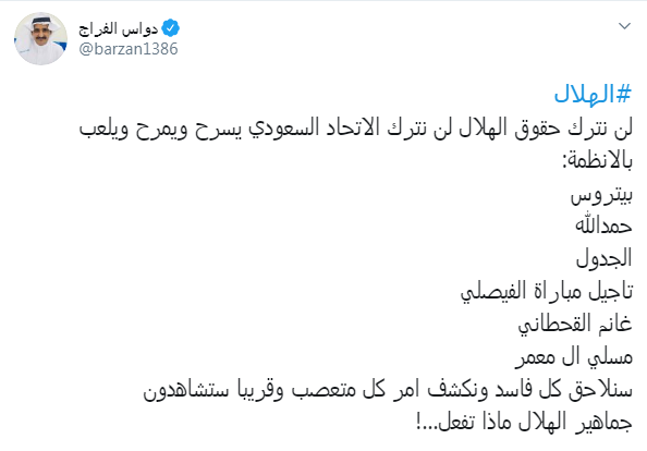 واختتم الفراج، تغريدته بالقول: "سنلاحق كل فاسد ونكشف أمر كل متعصب.. وقريبًا ستشاهدون جماهير الهلال ماذا تفعل".