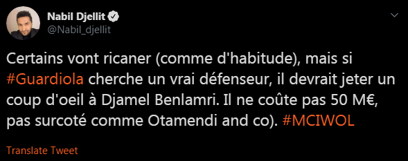 ونصح الصحفي نبيل جيليت، الذي يعمل في صحيفتي "الليكيب" و"فرانس فوتبول"، جوارديولا، بالتعاقد مع المدافع الدولي الجزائري جمال بلعمري، نجم نادي الشباب، خلال الميركاتو الشتوي القادم.
