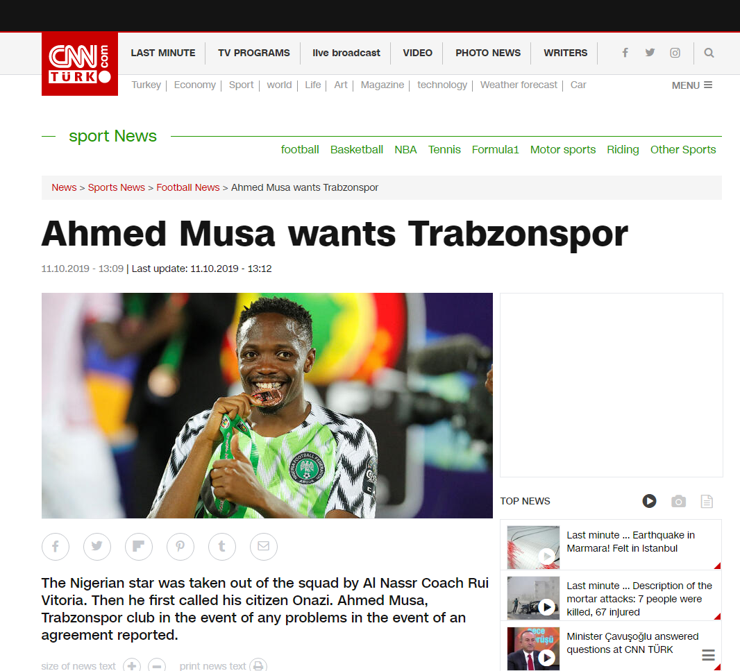 وأشارت شبكة "CNN التركية"، إلى إرسال موسى، رسالة إلى نادي طرابزون سبور التركي، عبر زميله في المنتخب أوجيني أونازي، يطالبهم فيها بالتفاوض مع فريقه النصر، للتعاقد معه في الشتاء القادم.