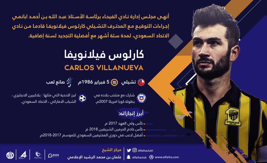 أعلن نادي الفيحاء عن تعاقده رسميًا مع النجم التشيلي كارلوس فيلانويفا، قادمًا من صفوف الاتحاد، خلال فترة الانتقالات الشتوية الجارية.