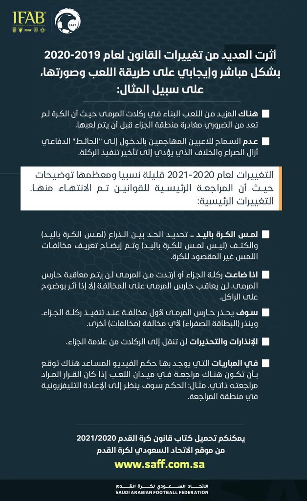 كشف الاتحاد السعودي لكرة القدم، عن أبرز التغييرات في قوانين كرة القدم، والتي ستطبق بداية من الموسم الرياضي الجديد 2020-2021.