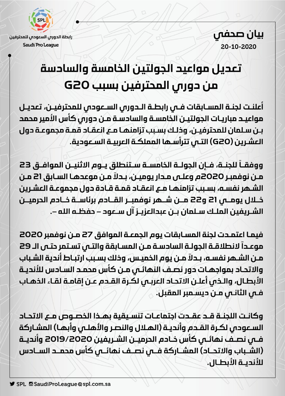 وأشارت إلى أن التأجيل، يعود إلى تزامن مواعيد مباريات الجولة الخامسة، مع قمة قادة دول مجموعة العشرين، برئاسة خادم الحرمين الشريفين، الملك سلمان بن عبدالعزيز – حفظه الله.