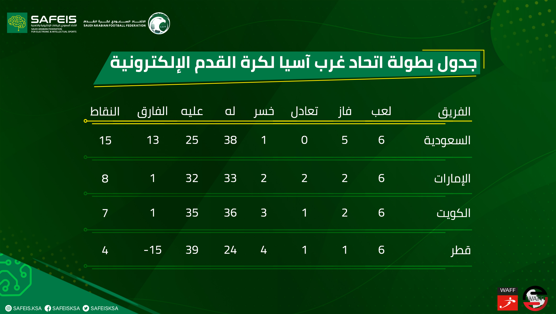 تأهل منتخب السعودية إلى المباراة النهائية من بطولة اتحاد غرب آسيا لكرة القدم الإليكترونية، ليلتقي بمنتخب الإمارات في النهائي.