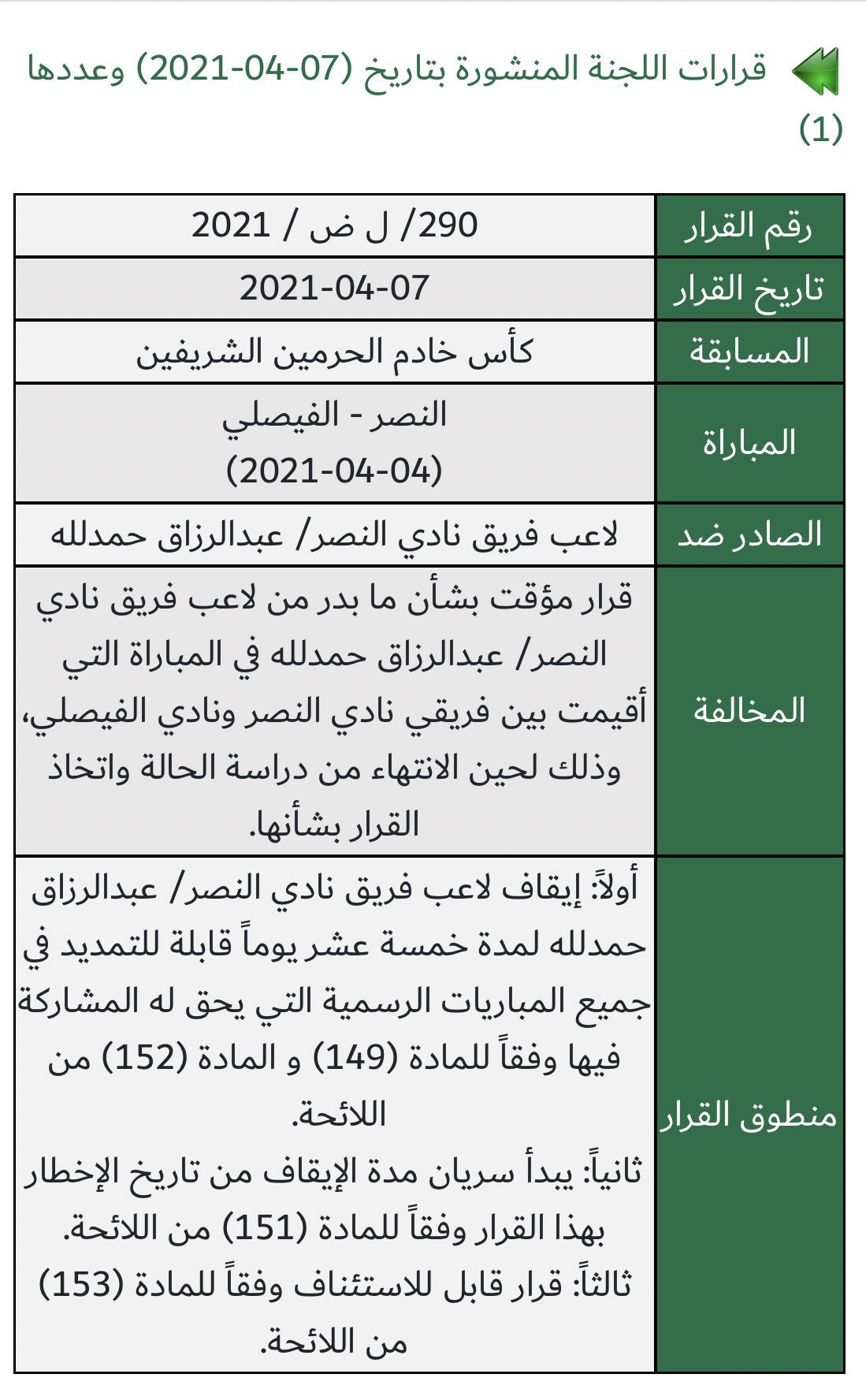 وحمد الله البالغ من العمر "30 سنة"، قام بحركات مشينة، خلال مباراة الفيصلي، والذي خسرها النصر، بهدف دون رد، ضمن منافسات نصف نهائي كأس خادم الحرمين الشريفين 2020-2021.