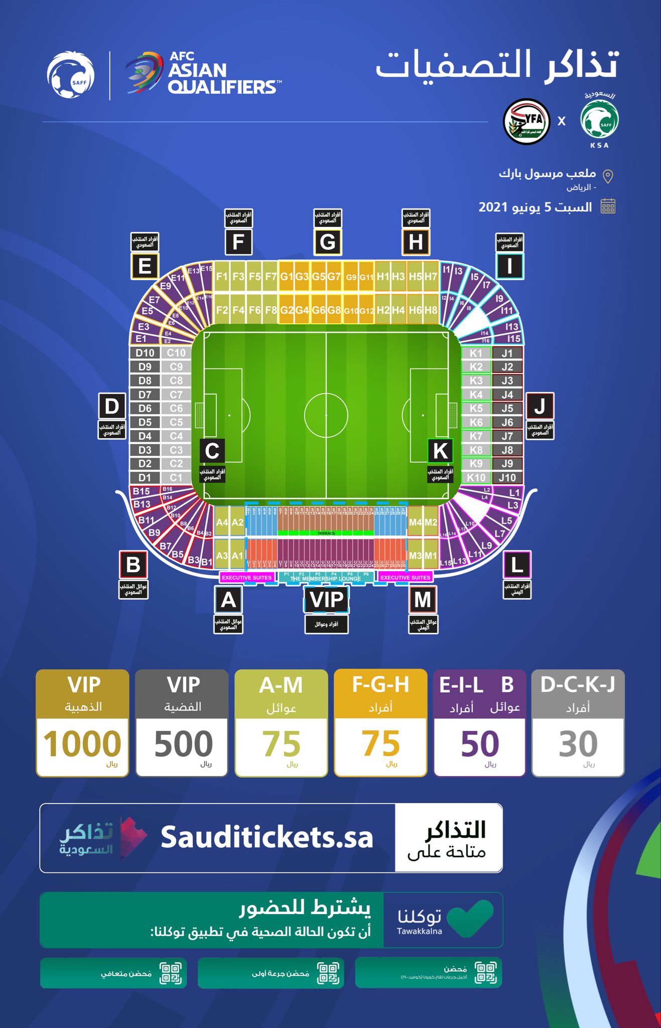 ويتم حجز تذاكر المباريات عبر منصة sauditickets.sa، حيث تتراوح الأسعار بين 30، 50، 76، 500، 1000 ريال.