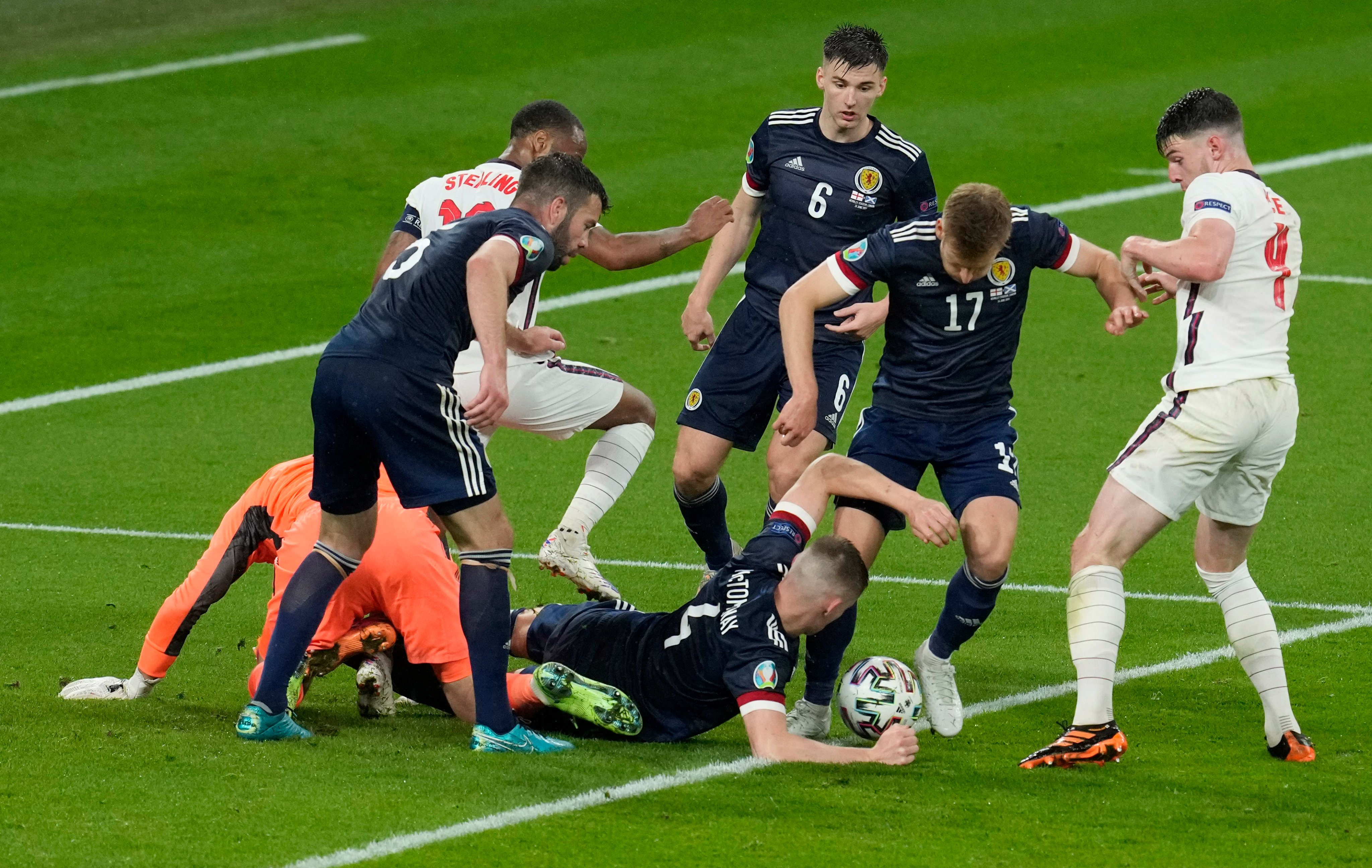 فشل الإنجليز في تحقيق الفوز أمام إسكتلندا، لكنه خرج بشباك نظيفة، في ظل تصديات جوردان بيكفورد الإعجازية، مثلما يظهر في الصورة.