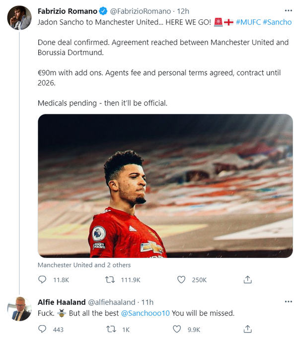 وعلق والد هالاند عبر حسابه الشخصي على "تويتر"، بشأن تأكيدات الصحفي فابريزيو رومانو حول انتقال جادون سانشو من دورتموند لمانشستر يونايتد الإنجليزي.