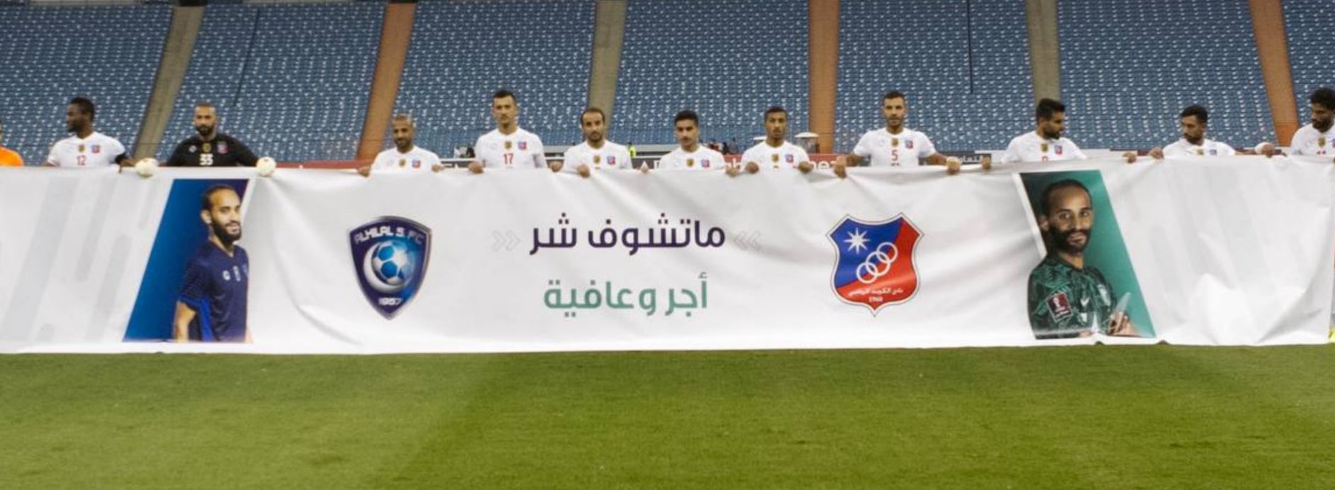 وفي أثناء عزف النشيد الكويتي، رفع نجوم الكويت، لافتة، مع صورة عطيف، كتب عليها: "ما تشوف شر.. أجر وعافية".