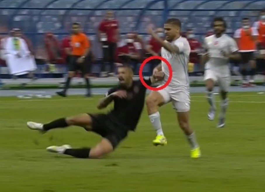ماذا حدث؟ كان النجم البرازيلي كارلوس جونيور في طريقه إلى الانفراد بالحارس عبد الله المعيوف، لكن الكولومبي جوستافو كويلار، أوقفه بـ"مسك يده"، ثم إسقاطه أرضًا.